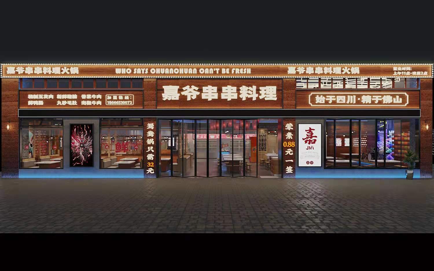此商铺由两间200多平米的商铺合并改造为400多平米的串串火锅店