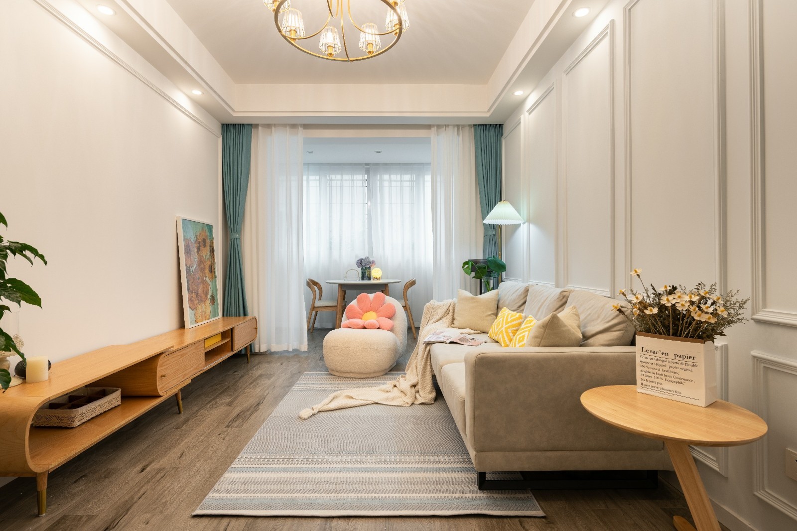 本案户型特别周正,所以没有做任何调整,也节约了硬装成本。在满足户主的需求下,做了以下一些特殊的设计。 ▲ 客厅用一些边几替代了笨重的茶几,空出来宽阔的空间给到孩子活动。 ▲ 由于原始户型将厨房和阳台连接,我们就将计就计将餐厅设计到阳台。将阳台封起来,保证了居住的舒适度,同时又加大了空间的实用性。