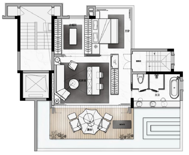复式二楼的主卧户型图、全层作为主卧设计、做了水池水幕的处理,为生活更加突出风趣