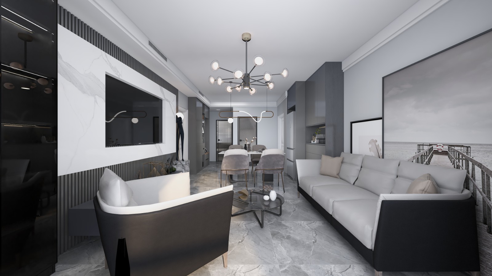 餐客厅统一布置,岩板电视背景墙。