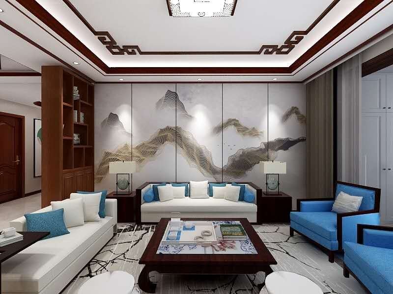 沙发背景选用山水画来应景中式风格。同时也体现了背靠山水的寓意。