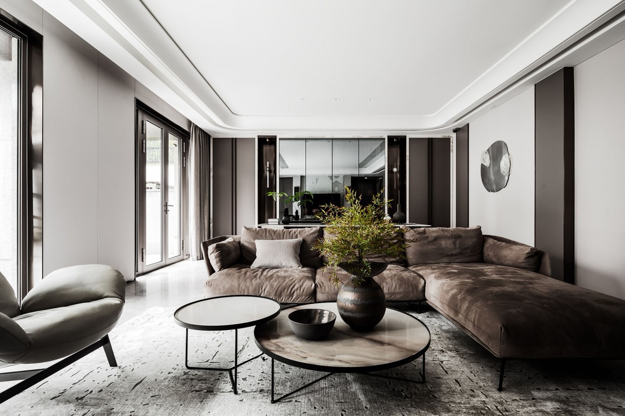 不锈钢、木饰面、岩板、墙布、硬包、中性底色,承托出材质奢华和自然的属性。
