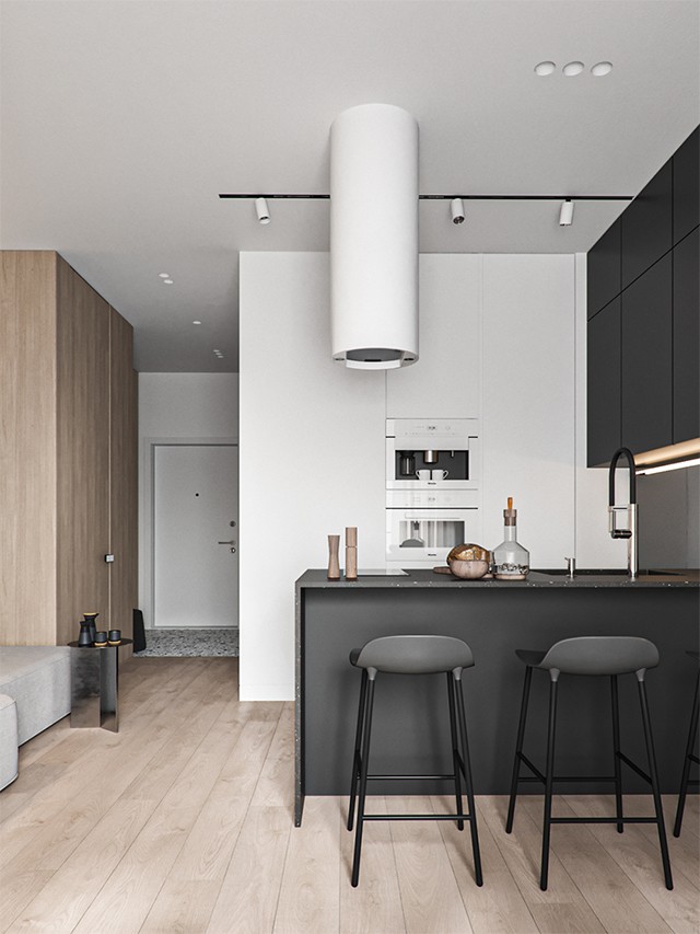 餐厨空间采用黑白双色中岛台选用黑色星空款人造石台面 烹饪电磁板上方配白色圆筒抽油烟机 一侧搭配三把黑色简洁吧台椅增加了餐厅功能