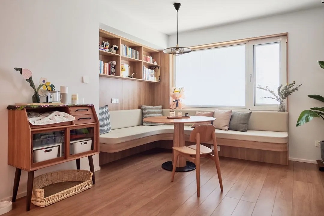 没有像传统方式一样让客厅和餐厅独立,而是用合围的卡座形成一个餐厨区,母女二人或者亲戚朋友来聚餐都很合适。电视机慢慢退出许多家庭的客厅,其实已经成为趋势。卡座背后用的是双层中空玻璃内置百叶帘。业主家里有养宠物,喜欢趴在卡座上晒太阳,百叶帘嵌在中空玻璃里面,能防止毛孩子扑跳玩闹的时候抓坏或者被缠住。
