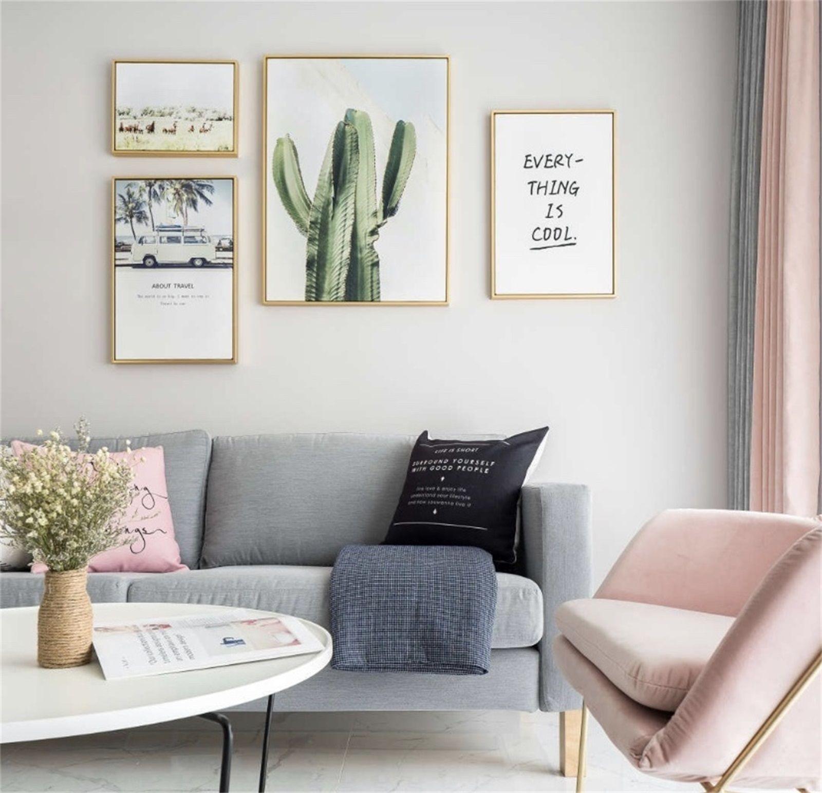 茶几搭配干净素雅触感柔软的地毯,赋予空间简约纯净的气息。白色棉麻质地的沙发像舒芙蕾一样松软,让人不由得想要深陷其中