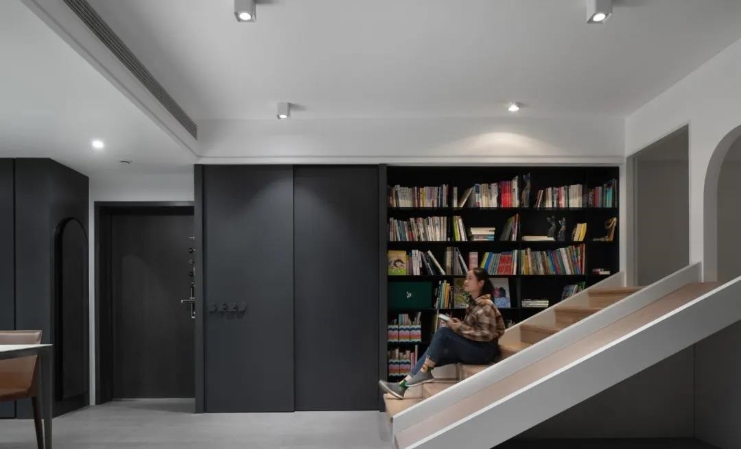 将原客厅与过道两间卧室的位置做了交换,现场定制孩子们专属的城堡滑梯,背景设计整面开放式书架,满足孩子们一起看书玩耍,滑梯正对餐厨区,女屋主下厨时也可以看到孩子的动态