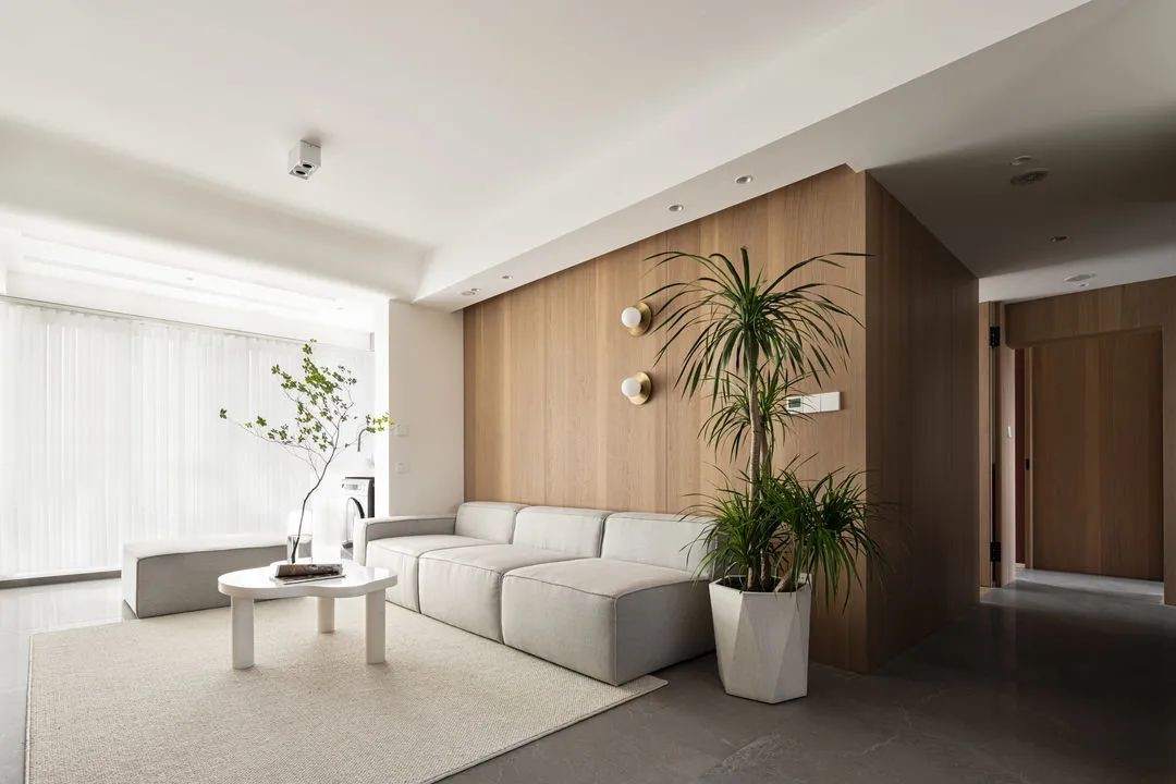 客厅以灰白色为主,利用木纹色做调剂,干净整洁又不失稳重大气。木工板打底的沙发墙,一直延伸到过道,与其他房门衔接在一起,形成一个完整的木饰面效果。卧室门都采用同色木纹隐形门设计。地面600*1200的中灰哑光地砖错缝铺贴,同色美缝剂美缝,整体性更高。