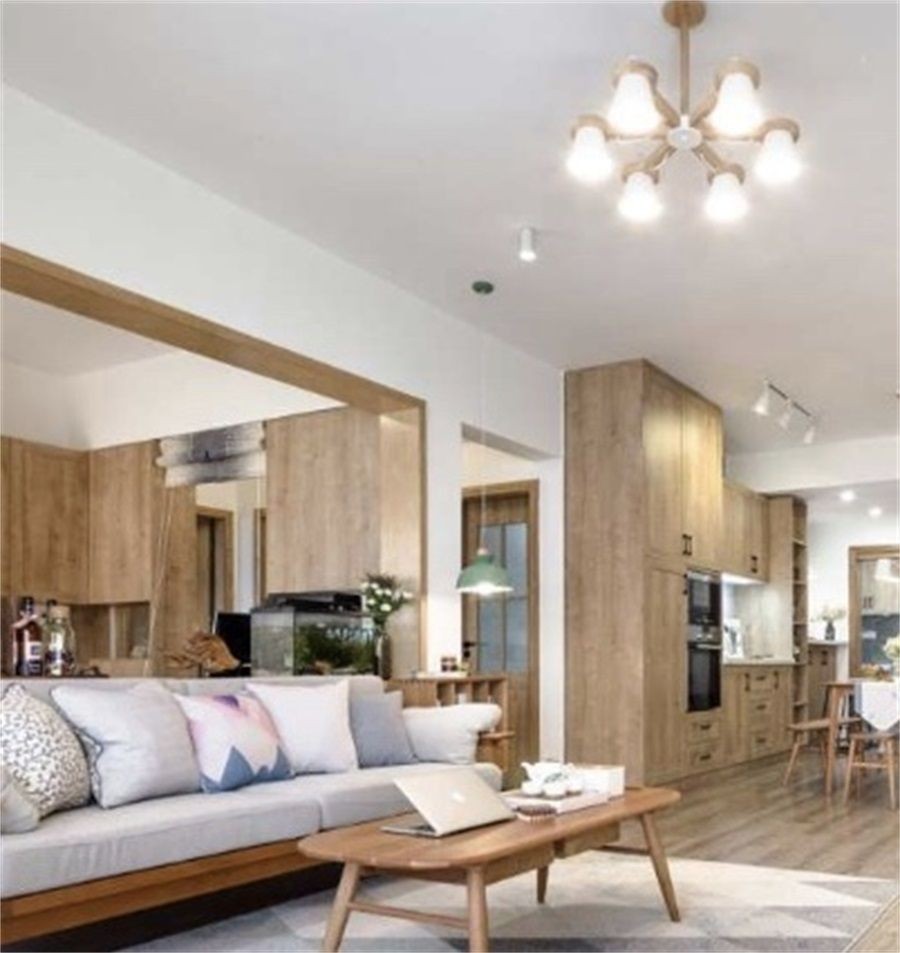 整体主要采用灰色、白色、木色以及黑色做为点缀进行合理搭配。 灯光的处理是选用了无主灯的设计