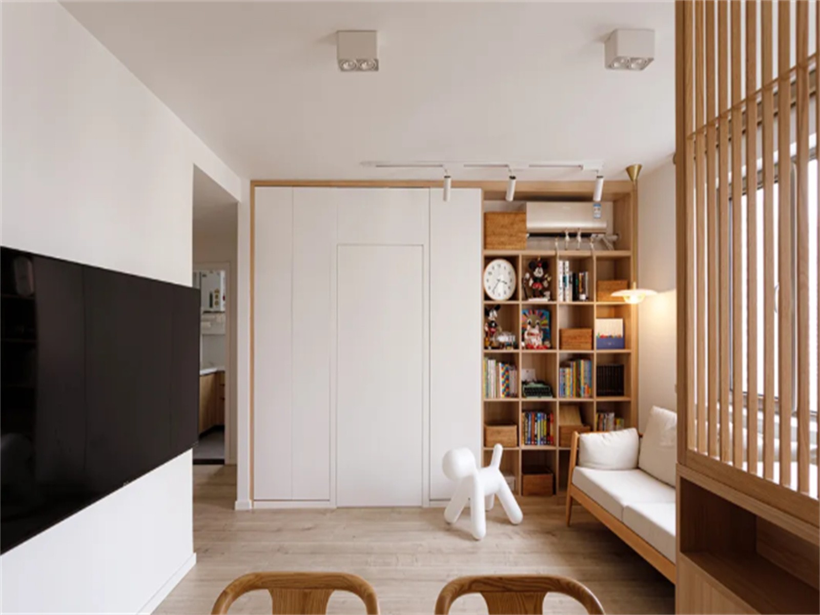 客厅一侧是通往儿童房的纯白色隐形门