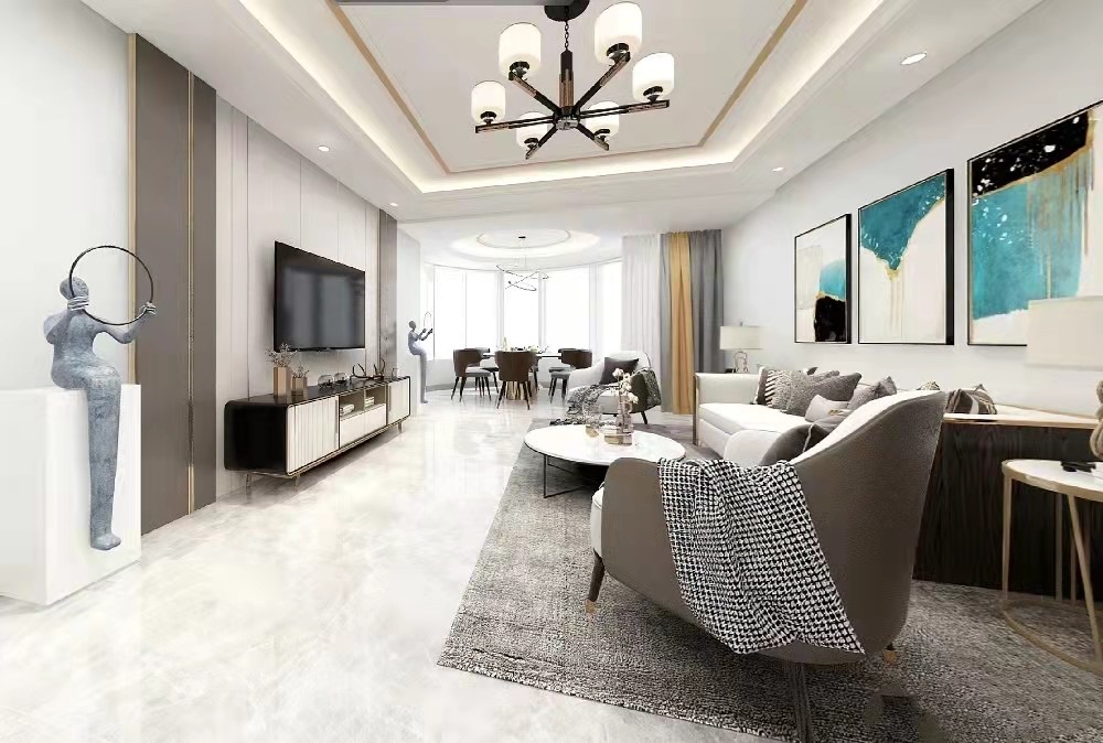客厅餐厅关联,顶面造型金色金属条和背景墙,窗帘,装饰画分别呼应,空间更加整体统一