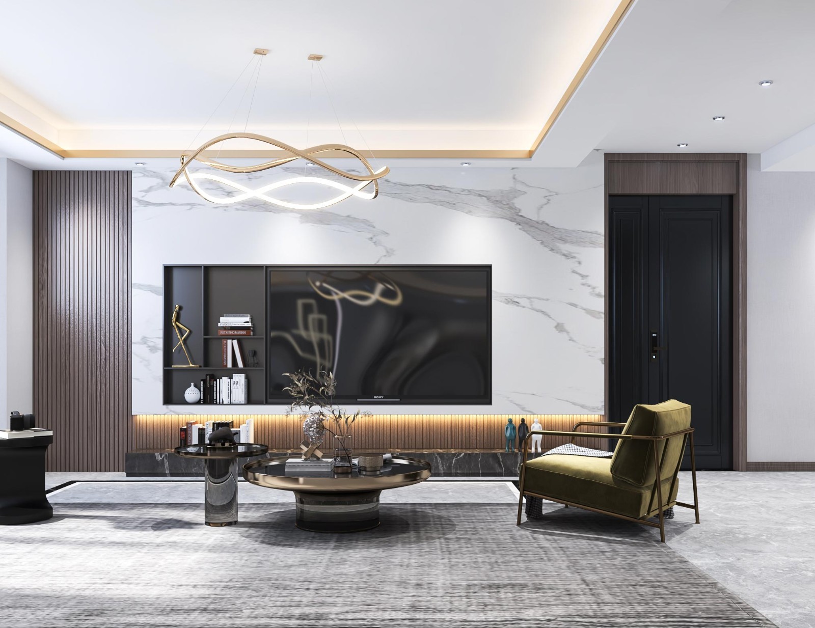 客厅以灰色为主基调, 利用影调、线条、对比、明暗反差,塑造出简单却令人产生无限暇想的效果。