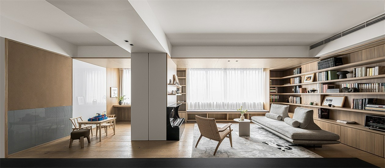 整个公共区域承担了会客厅、餐厅、厨房、儿童活动区、等区域功能,环绕整个空间的书架与储存柜体一起形成整个空间的包围感。视线在整个空间并无死角。