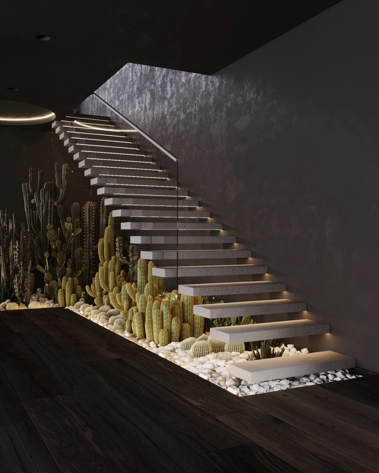 颇具艺术性的悬空楼梯,为深色的空间氛围增添了一丝浪漫的气息 , 颇有意境,精致而优雅。