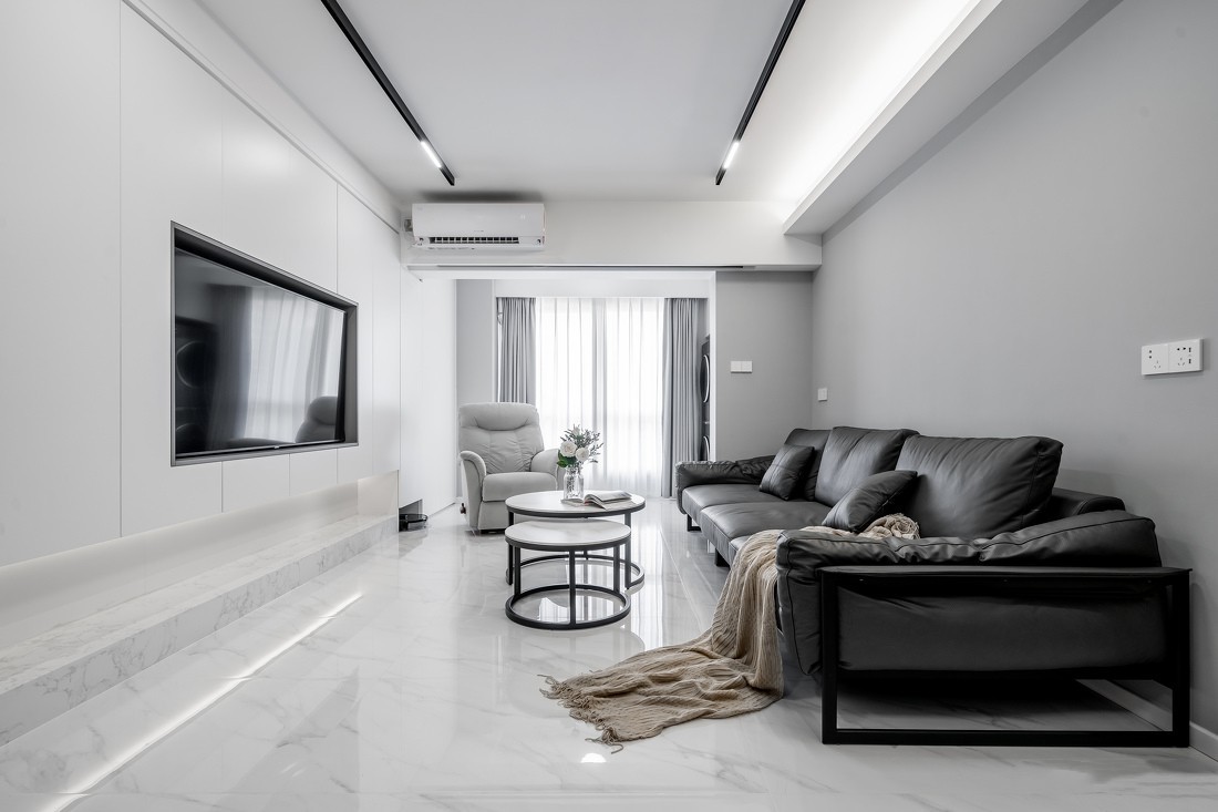 整个客厅保持着设计的克制,灰白色为主体颜色;无主灯设计空间上市教委更加精练;也很好提升整个空间的灯光质感;蒸面的柜子把电视内嵌其中;没有一丝多余暴露在外;极简设计中减法大于加法。