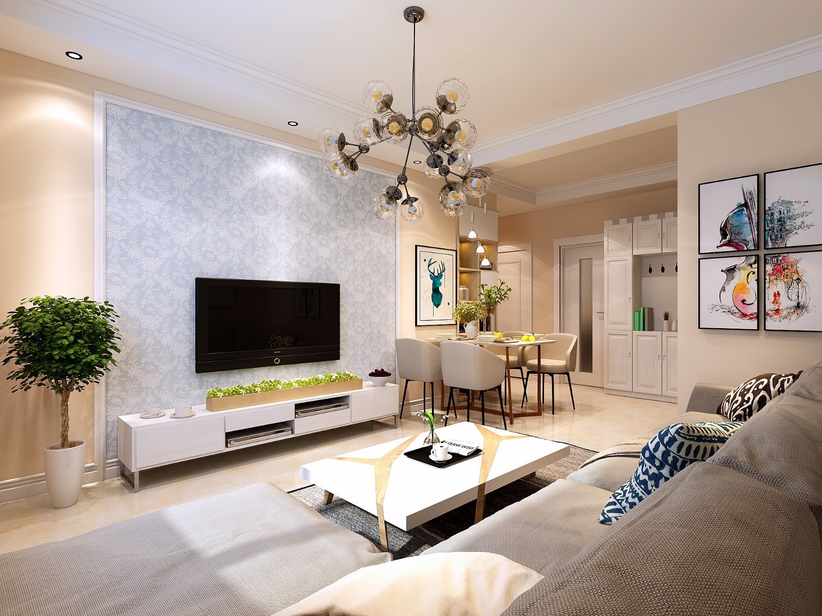 整体以简约为主,背景墙运用了简单线条做框架,中间壁纸做装饰,缩小走廊空间,既增加餐区又多了储物功能