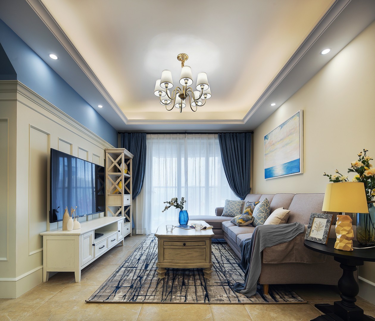整个客厅舒适而温馨,大地色的地砖和蓝色墙面及白色护墙板稳重而不失清新,餐厅卡座设计又有功能性又增加了休闲区域,加上线条打造的层次感,精致之感扑面而来。花瓣状的灯具、木质的茶几、舒服的沙发、精美的挂画,让整个空间休闲舒适