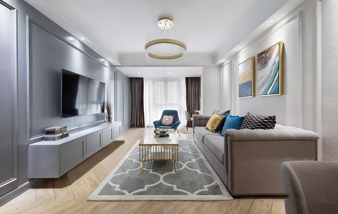 蓝色用于单人座椅、抱枕及装饰画之上,令层次感得以突出。穿插少许奢华的金色点缀空间,整体色调更加丰富而。