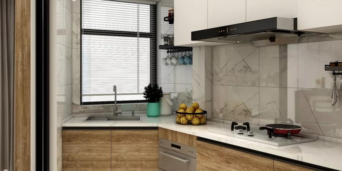 厨房根据斜角设计橱柜,充分合理利用空间。