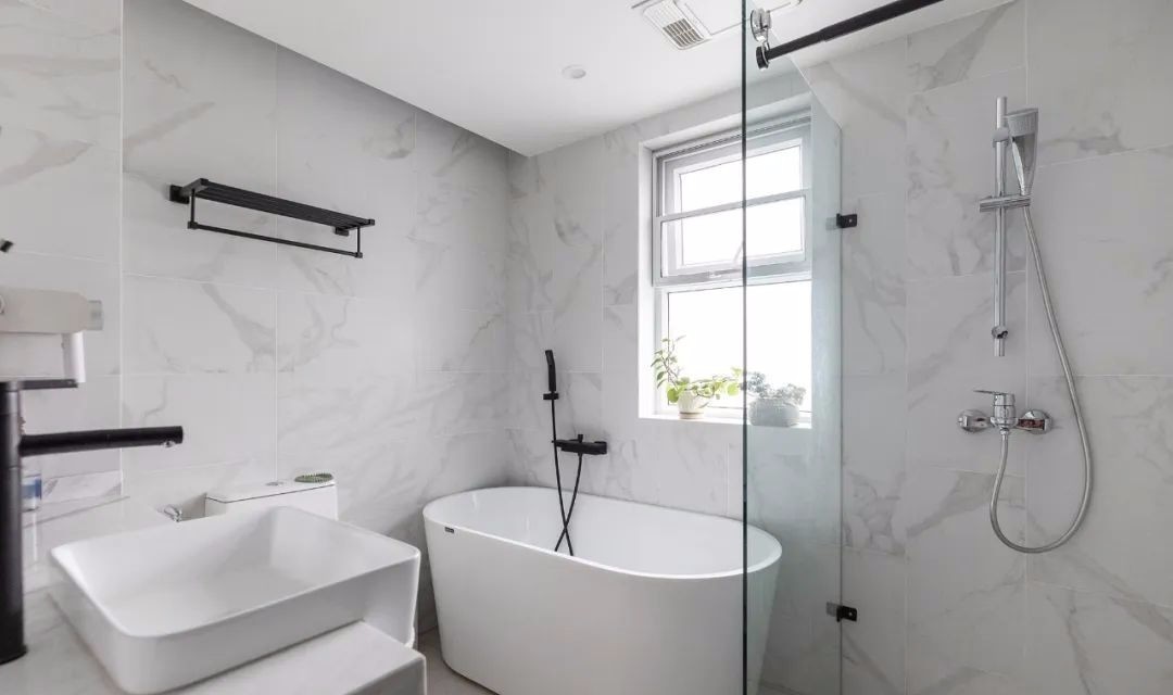 主卫大量铺贴大理石纹瓷砖,就连洗面台也是大理石的,整体非常的明亮简洁大气。