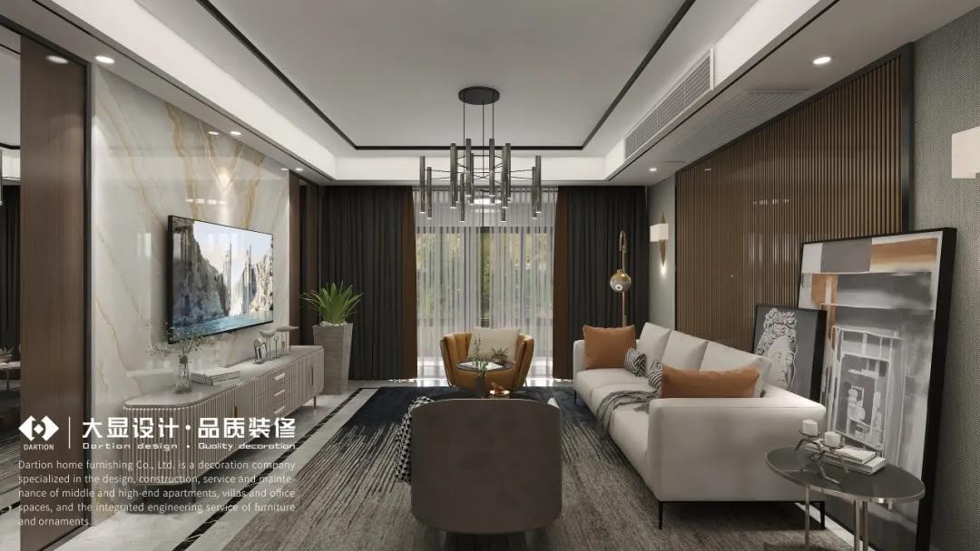 客厅整体简约雅致、静宁安然,硬装大部分使用大理石与玻璃,有使用软装来中和大理石与玻璃的冷硬感,