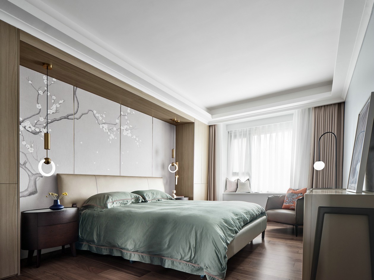 主卧同样采用无主灯设计,留出了干净的顶面,氛围灯让室内更加温柔舒缓。床头背景墙的一幅梅花中国画,将柔美与力量融汇一体,带来平静舒畅的气场,能够抚平居住者心中的杂乱困扰。床头灯和背景墙上的金属元素,增加了空间质感,让室内更具轻奢雅气。