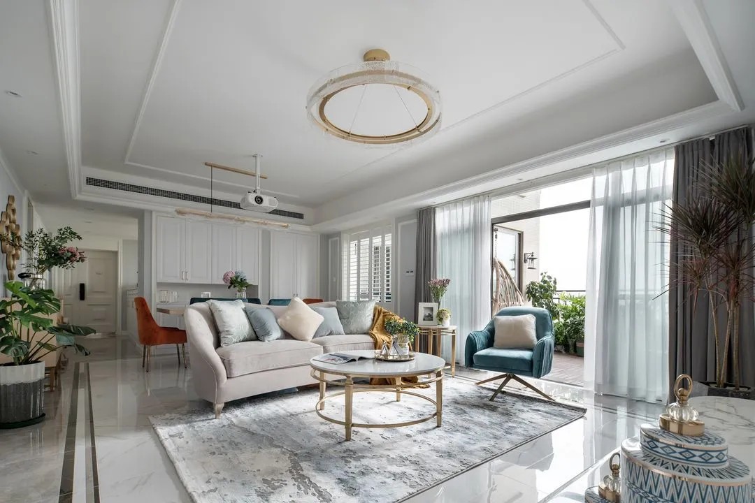 整体采光还是非常不错的。屋主是个三代同堂的家庭,装修上围绕了家庭成员的需求而展开,以美式轻奢为主题,利用浅灰、暖灰、 灰、灰蓝等色系,打造出柔静的空间氛围,精致又格调,越看越舒服!