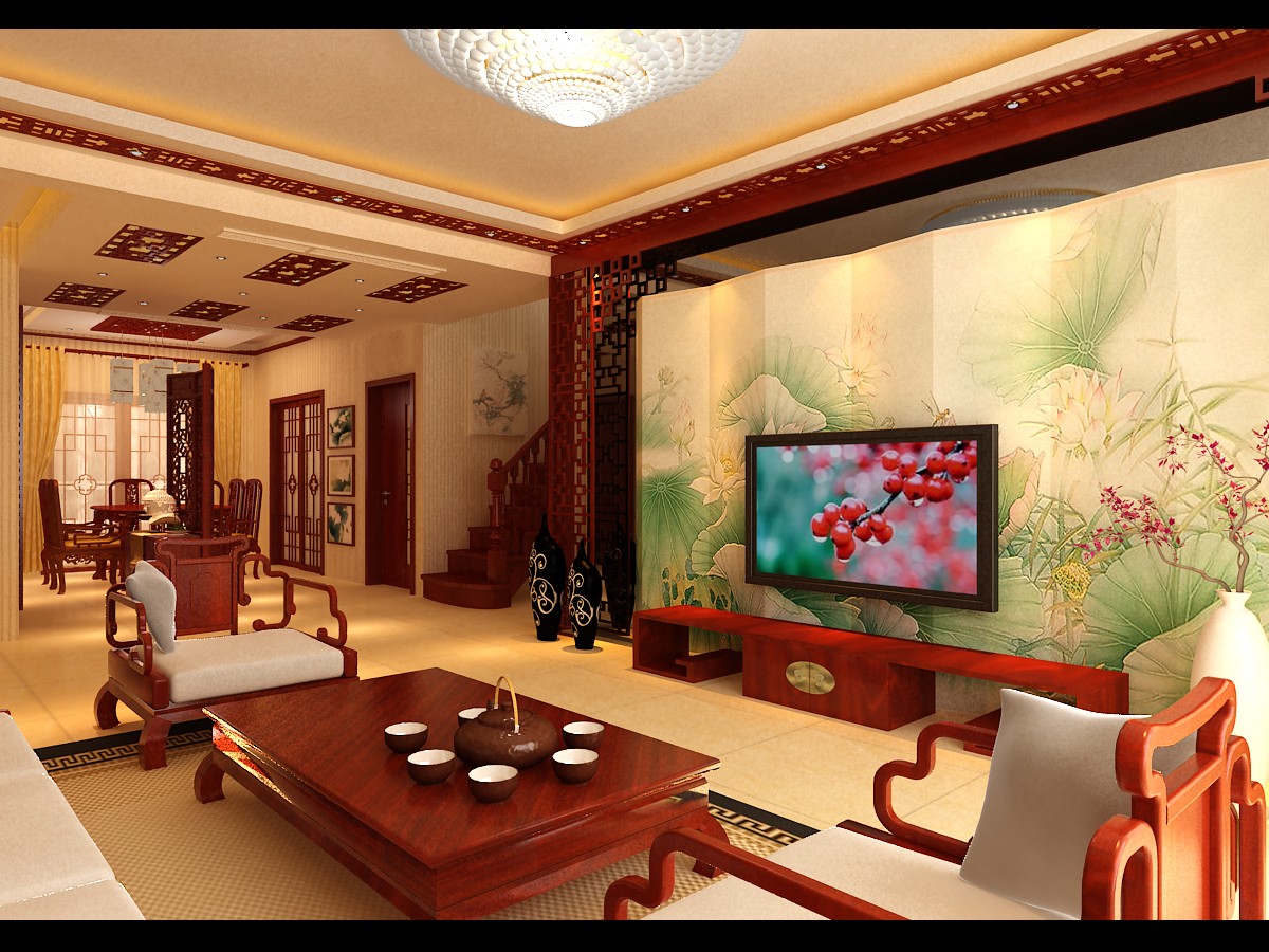 联排别墅,业主要求中式风格,荷塘月色,以大幅壁画和镜面,寓意青莲出淤泥而不染~
