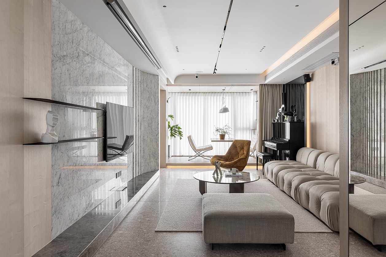 全屋采用无主灯和局部线性灯光设计,营造放松、温馨氛围,整体以白色、浅色的木饰面为主,搭配小面积的镜面穿插,融合自然纹理的石材点缀,通过对材质、细节的整合把控,进一步达到对空间本身的塑造以让心灵找到归属.