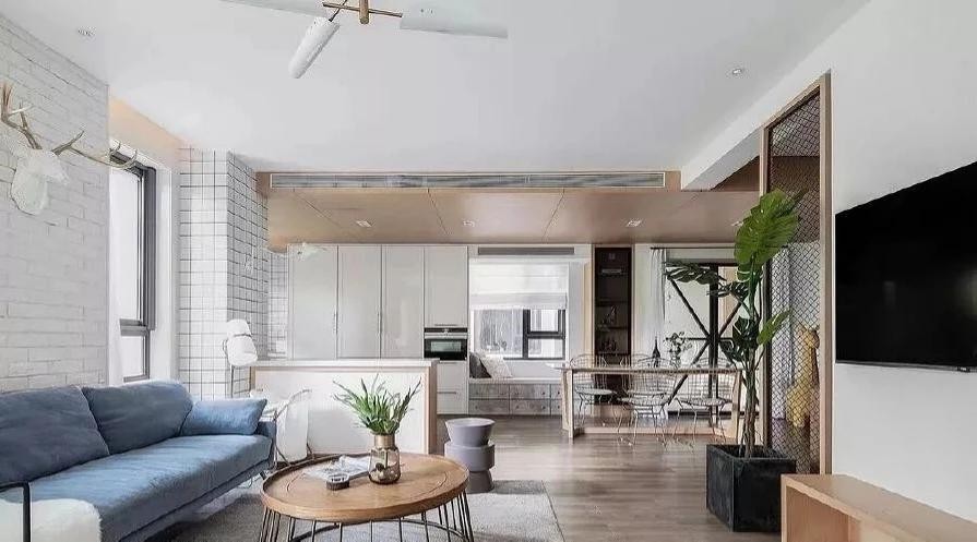 玄关隔断背后放了一盆大叶绿植,即起着遮挡视线的作用,又健康养眼。从阳台的视角看,整个空间非常的敞亮,客餐厨房全开放,让整体空间更加连通,更加自由。