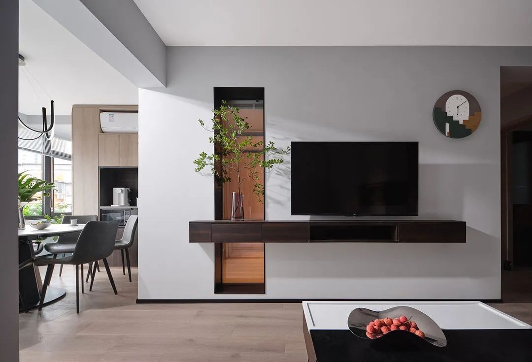 把电视墙处原有的门封上,在旁边位置挖一个矩形小门洞,一方面可以借光,另一方面造型上取得似断非断的借景意境。