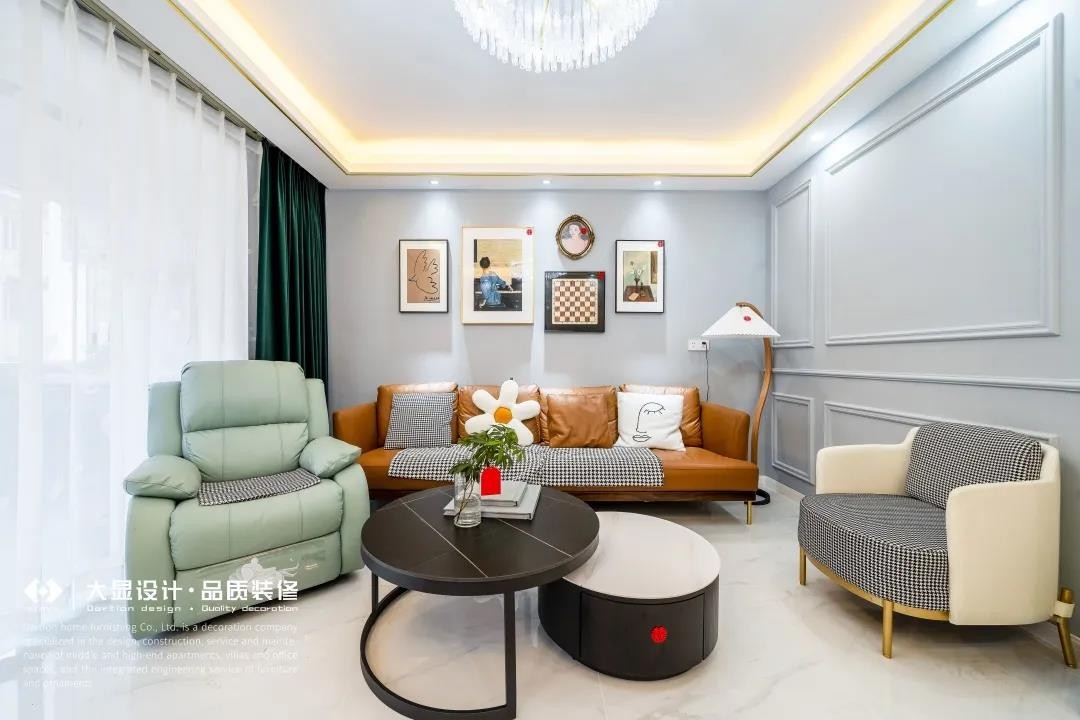 每一个物件都有属于自己的语言,女主人喜欢的欧式人物像以及抽象派插画,唤醒了空间的生命,用丰富意象的力量感巧妙平衡了的大理石底色。 沙发区做了两面薄荷蓝乳胶漆沙发背景墙,石膏线条在客厅中有序穿插,单沙发、三人沙发作为客厅的直觉重心,形态各异,富有张力;沙发旁的落地灯、黑白撞色创意茶几,透露出属于年轻人的摩登精致范,将艺术化的审美意涵散发至空间每一处。