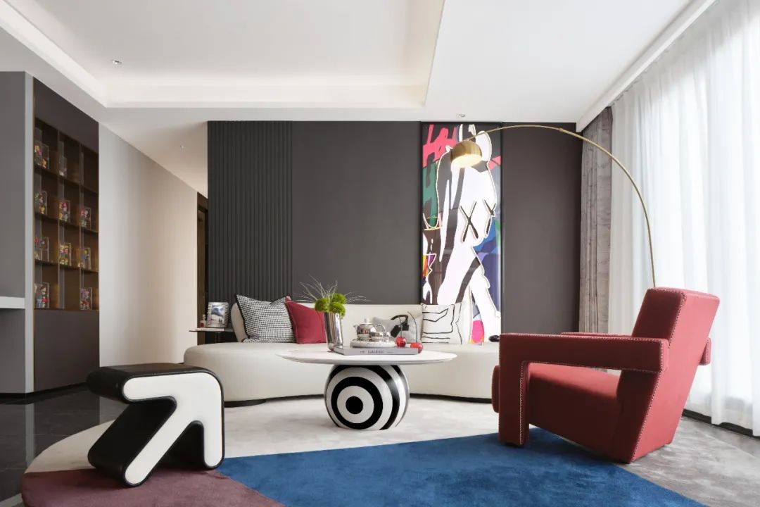 本案中,设计师以积木熊为精神起笔,举重若轻地构筑出都市新贵的思维之地。 ***灰与皮革、石材等材料的搭配是家居空间中少见的重彩,在这里则精准传达出都市人的深邃含蓄,锋芒暗藏。红蓝亦是浓烈的碰撞,热烈如火是感性,沉静如蓝是理性。情与理相互依存又相互对立,在客厅形成了极富感染性的张力,与Kaws艺术画所积蓄的复杂情绪相互咬合。
