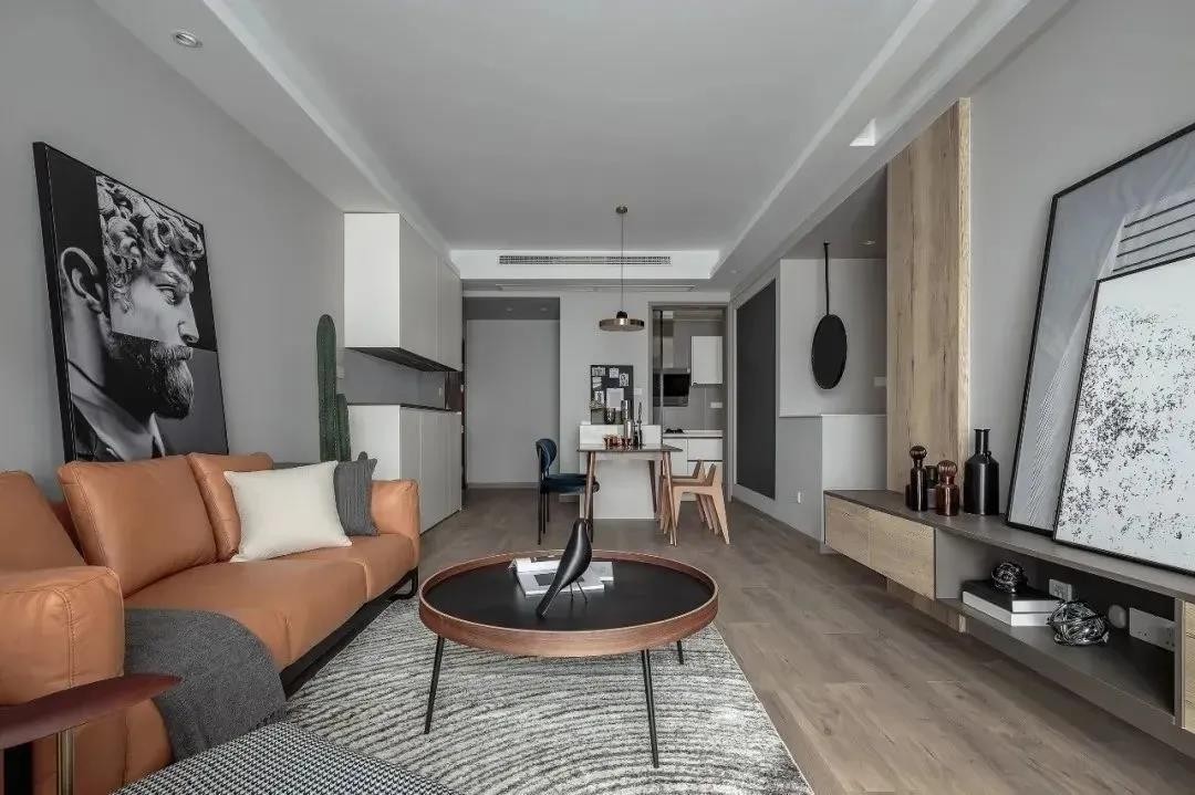 玄关进来之后就可以看到客厅、餐厅、走廊过道,厨房在餐厅的旁边,有玻璃推拉门隔绝油烟,还能让光线进入厨房。 客厅里墙面是浅灰色的,棕色皮质沙发上随意摆放一副挂画装饰,时尚又自在的感觉。细腿的圆形茶几,地面铺灰色地毯,简约又和谐。