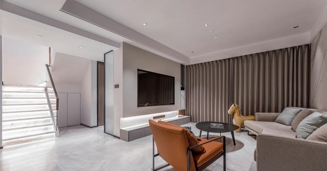 客厅所有造型都非常的简洁,柜体不做把手,不做浮夸的造型,就连楼梯下的储藏间都用了隐形门的设计,同时不忘做设计安全性考虑,在楼梯处做暗藏灯带处理