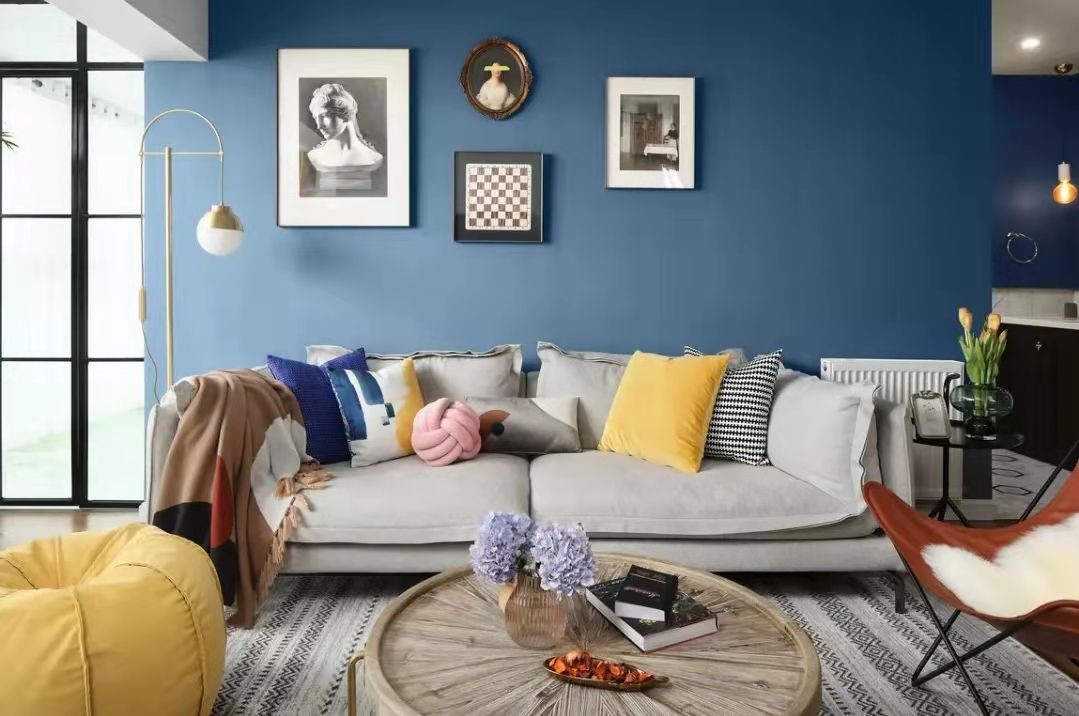 灰色布艺沙发加以黄蓝两色调的抱枕装点,让人不由得想要深陷其中。