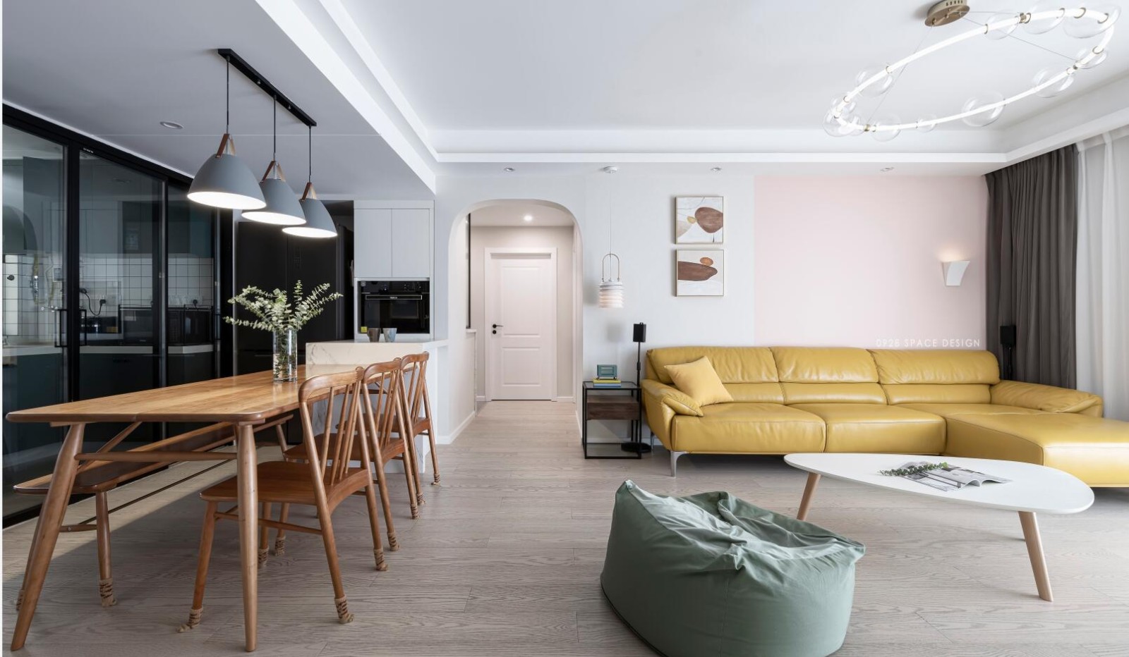 客餐厅与西厨相连,LDK的设计让公共区域更显开阔而大气,也方便了空间互动,因为西厨与餐厅是原厨房的位置,顶上有横梁,设计师做跌级吊顶区分两大功能区,卧室走廊的入口做拱形门,增添了文艺浪漫的氛围。