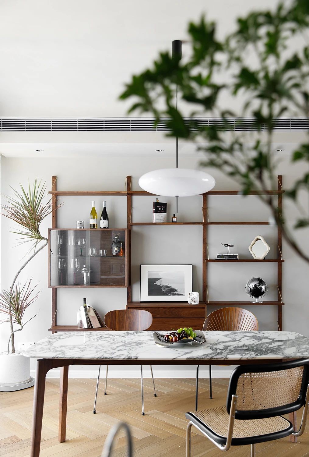 定制餐边中古柜,特殊的安装方式与多样的陈列收纳功能,使之成为这个家最吸睛的一处景致,在暖色灯光映照下,陈列的摆件、酒品、书籍,散发出古朴又精致的气息。