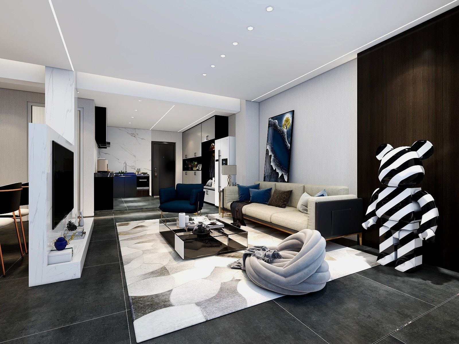 客厅空间呢黑白灰占用了百分之七十的空间,运用了孔雀蓝使空间色彩更加活跃。