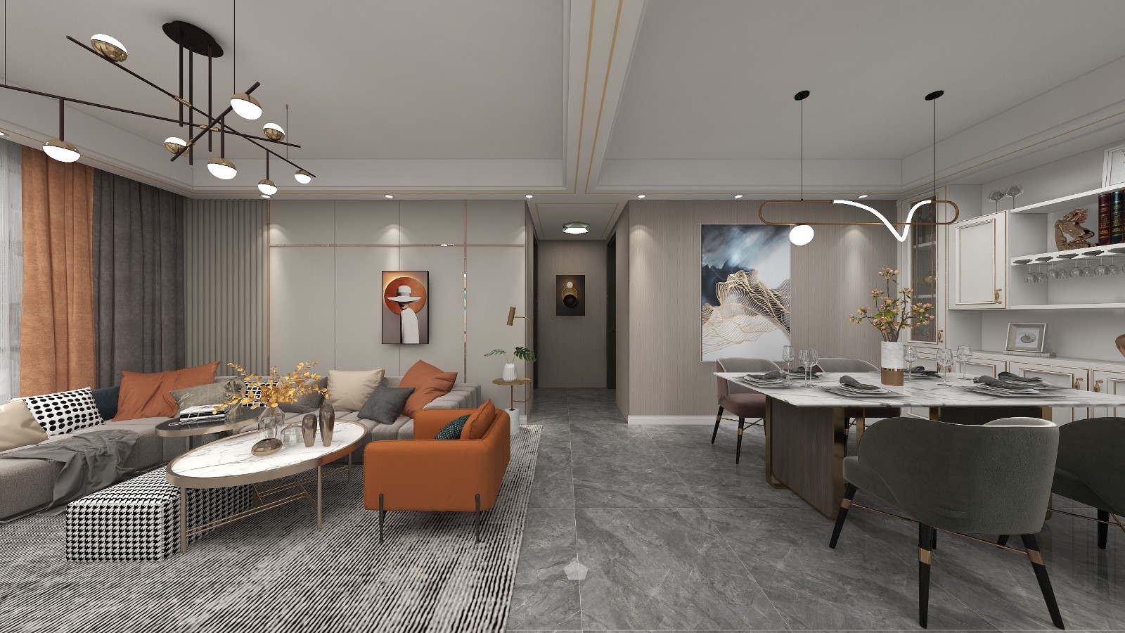望江大客厅是年轻人最喜爱的“双眼皮吊顶”,造型吊顶配金属线条与造型独特的吊灯相互呼应。一把爱马仕橙色的沙发椅,让“理性”的客厅多了几分活泼的跳跃,墙上的壁画与整个客厅的调性有着说不上来的协调,宜动宜静的舒适感扑面而来。