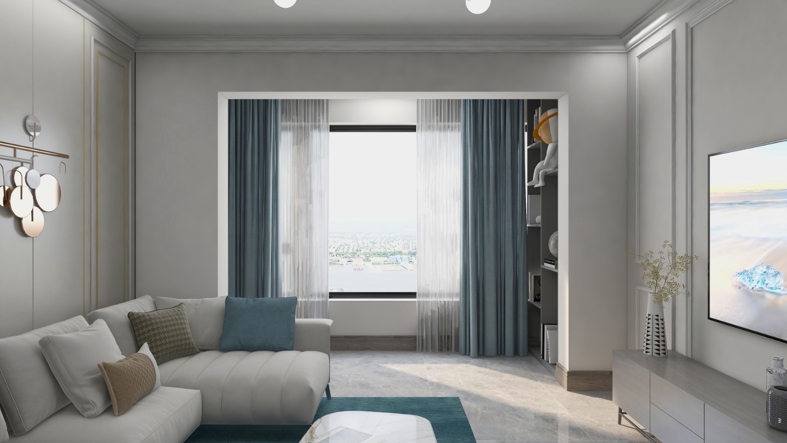 主卧以质感的灰色作为主基调,从容不迫,一笔蓝色勾勒出空间的细节。