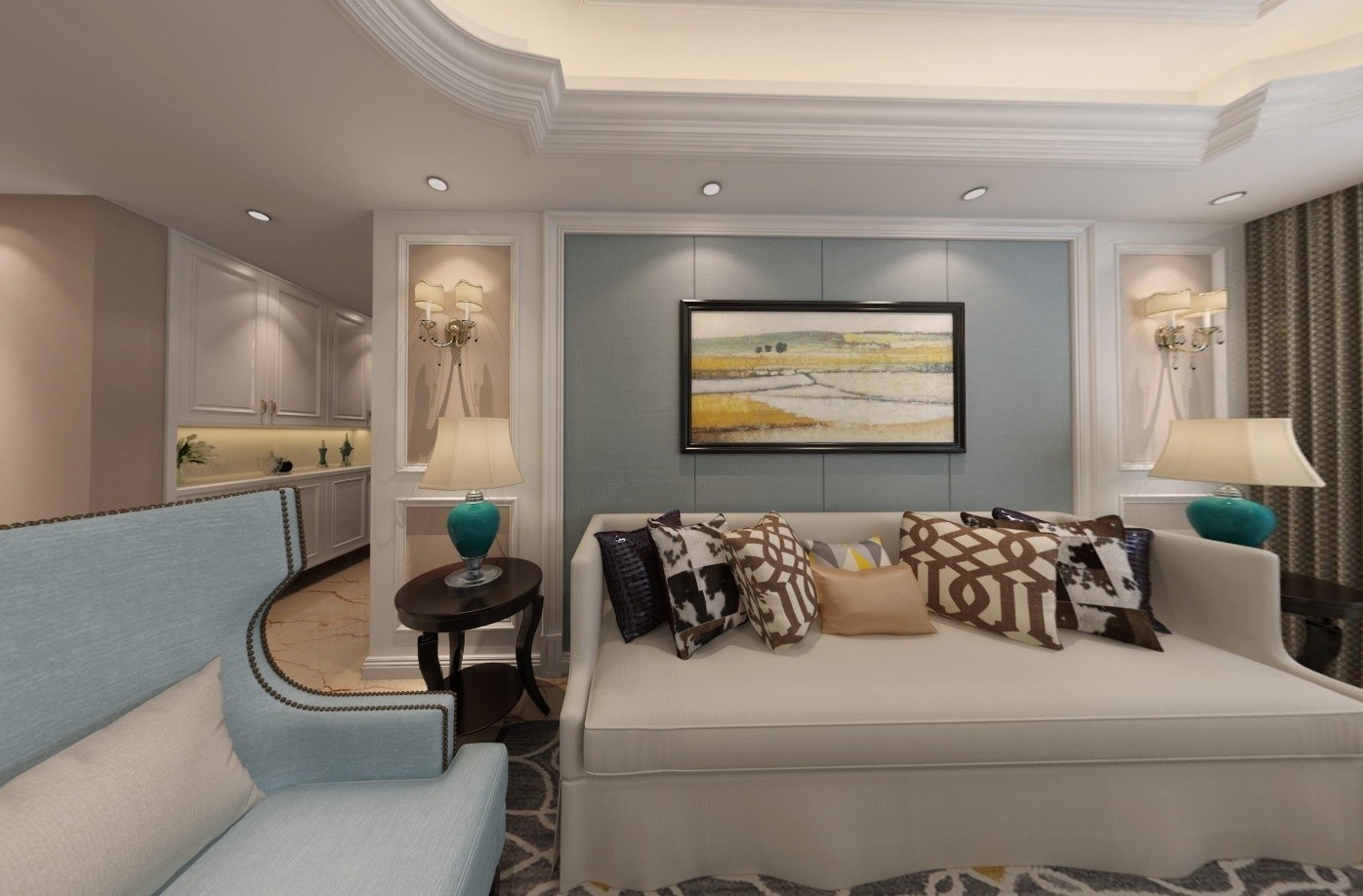 房屋使用了石膏吊顶,在吊顶中埋了灯带,客厅也整体采用了无主灯设计思路。