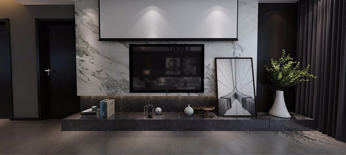 客厅主打深灰地面,电视背景墙面采用了白色石纹,在背景墙与地面之间打造了一个石材质地台。稳妥连接才者,让这个大空间客厅层次更丰富。