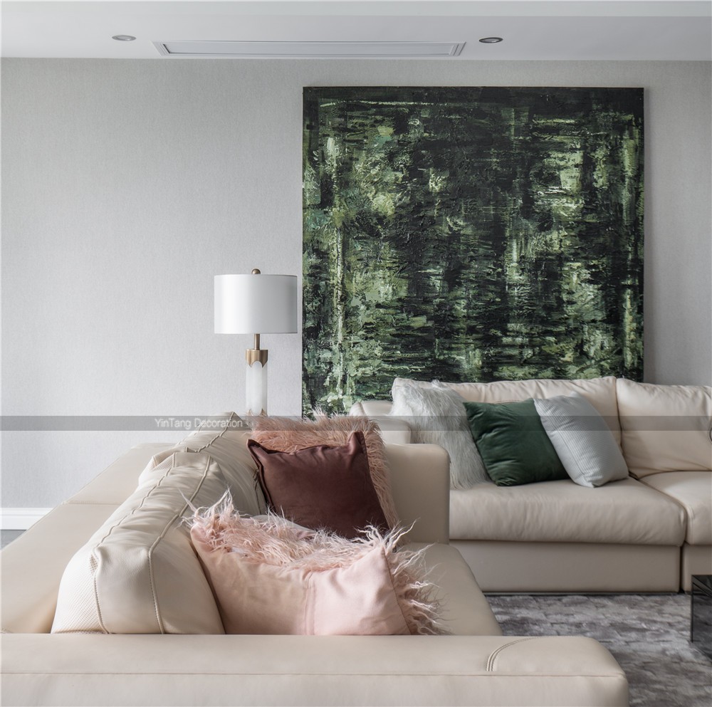 墙上的挂画是客厅的点睛之笔。 细细观之,就好像打开了一扇通往森林的任意门。 阳光透过郁郁葱葱的绿叶,影影绰绰,随风摇曳,沙沙声不绝于耳。