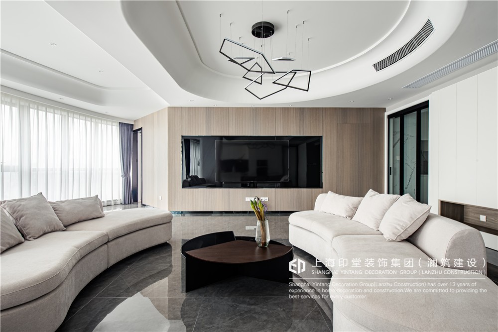 顶面的吊顶不规则的圆弧,和沙发相呼应,线条更加的流畅。