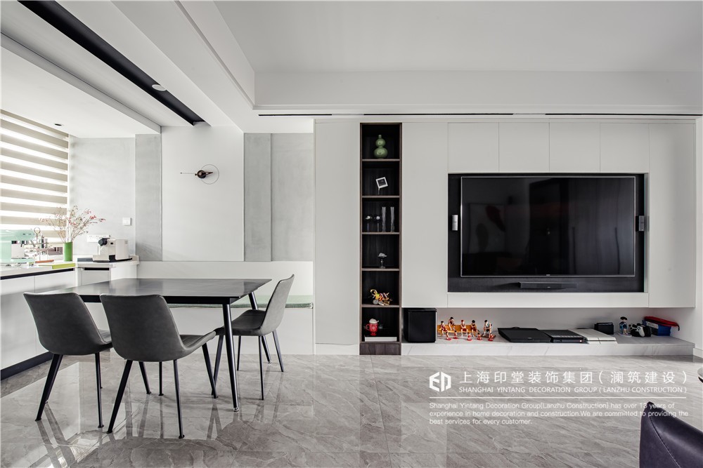 客厅保持黑白灰的***感简约色调,黑色皮质沙发更显质感,黑白搭配的回字形电视柜