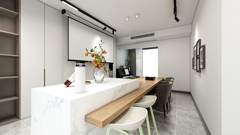电视墙考虑投影,简洁大气,考虑业主一家平时很少使用,所以当收纳起来过后便是一整体的储物柜。