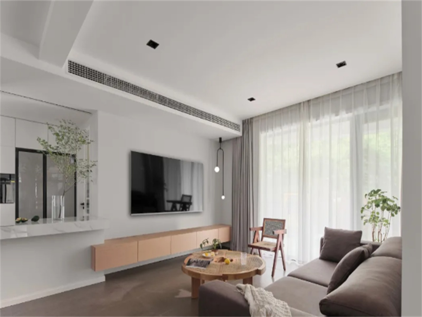 客厅落地窗外是一个精致的庭院,纱帘后的绿意若隐若现,增加意境氛围