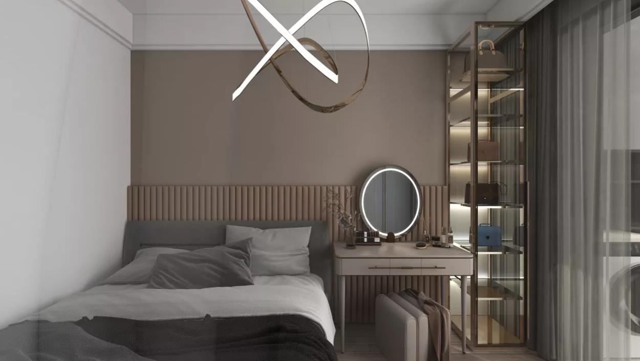 整体棕色和灰色的床形成对比,左边放置物柜,用于展示物品