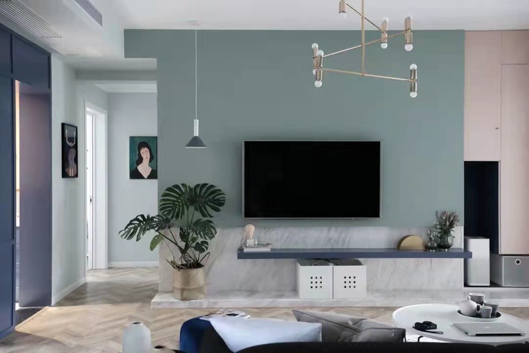电视背景墙通过乳胶漆、 木作隔板、爵士白石材组合而成, 在化解原墙本身缺陷的同时丰富了视觉体验, 空气净化器也被巧妙地安排到背景墙的壁龛处。