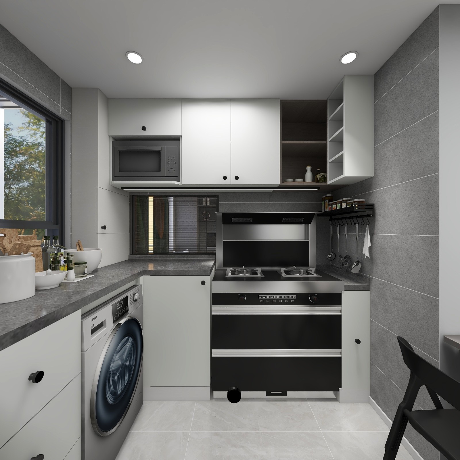 选用美大集成灶使用高度比橱柜操作台面低5公分,炒菜舒服。相比传统的油烟机,美大集成灶既能带上一个电器,还能增加一组吊柜储物。利用墙角增加了一部分开放格做置物架,方便拿取调料。